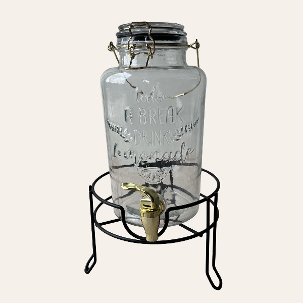 Deze glazen limonadetap met standaard is ideaal voor het serveren van verfrissende drankjes tijdens een bruiloft, feest of event. De combinatie van een glazen dispenser met kraantje en een metalen standaard zorgt voor een stijlvolle én praktische presentatie.