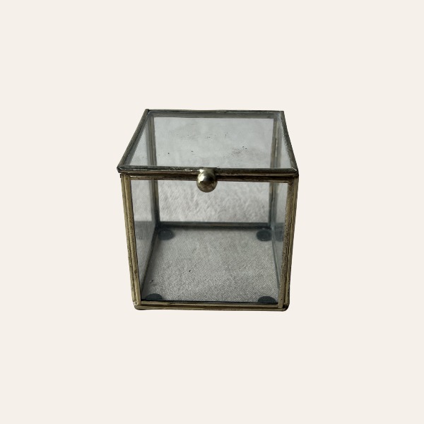 Dit vierkante glazen ringdoosje met goudkleurig metalen frame is een stijlvolle manier om trouwringen te presenteren tijdens de huwelijksceremonie. Het minimalistische ontwerp en het transparante glas zorgen ervoor dat de ringen prachtig zichtbaar zijn tijdens het moment van de ceremonie.